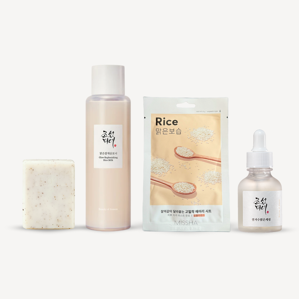 Set creado para calmar, hidratar y devolverle confort a la piel. El jabón de arroz limpia suavemente sin resecar, el tónico de arroz hidrata y equilibra, la mascarilla aporta un extra de luminosidad y el serum de ginseng ayuda a revitalizar la piel y mejorar la apariencia de las líneas de expresión.